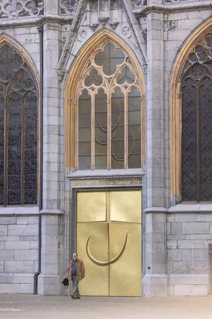 La cathédrale de Liège vient de se doter d’une entrée qui se veut comme un manifeste, comme signe éclatant qui veut marquer l’invitation à entrer, comme un programme qui atteste la volonté d’intégrer la culture d’aujourd’hui et répondre aux exigences de l’entrée d’un édifice public. Le nouveau portail se décline en deux créations complémentaires : une porte en laiton doré, collaboration entre l’artiste et les Ateliers St Jacques de la Fondation de Coubertin (à Saint-Rémy-lès-Chevreuse) et un vitrail en flooting sur une maquette du même artiste réalisé dans les Ateliers Loire de Chartres.